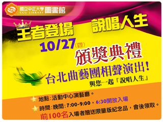 (記者林博文/嘉義縣報導)由國立中正大學圖書館舉辦的「2011跨學院閱讀與創意競賽暨文學創作獎」頒獎典禮,將於10月27日(四)晚間7:00於活動中心演藝廳隆重登場。典禮以「王者登場,說唱人生」為主題,邀請到享譽說唱藝術...(詳全文) |